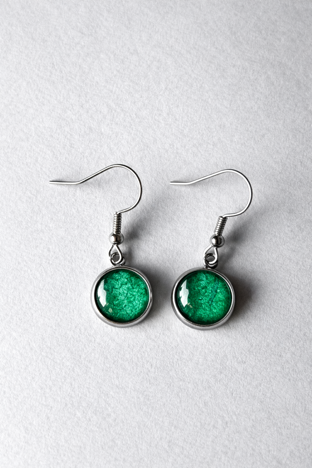 Oczko o średnicy 10 mm wykonane zostało z papieru ryżowego z widocznymi włóknami, zatopionego pod szklanym kaboszonem. Papier zabezpieczony jest fiksatywą, a całość utwardzona klejem UV — zgodnie z procesem stosowanym w pozostałych projektach — co zapewnia trwałość oraz charakterystyczny, organiczny efekt głębi widoczny pod szkłem.