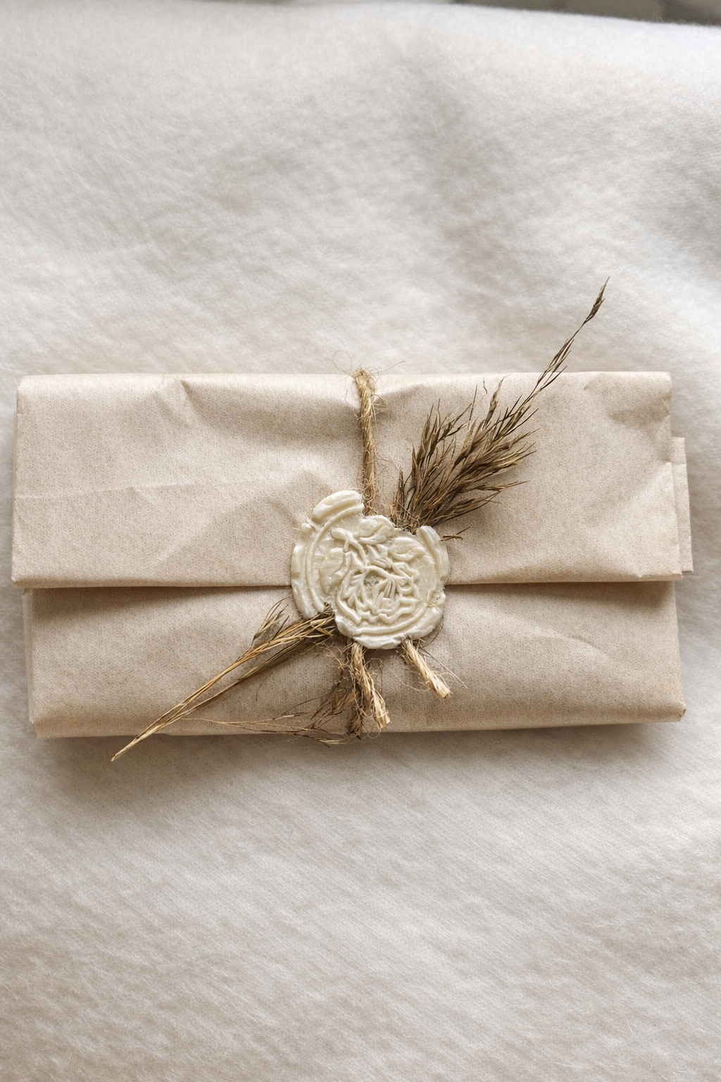 Pakunek przewiązuję jutowym sznurkiem lub elegancką wstążką, a jego front zdobi lakowa pieczęć oraz suszone kwiaty.